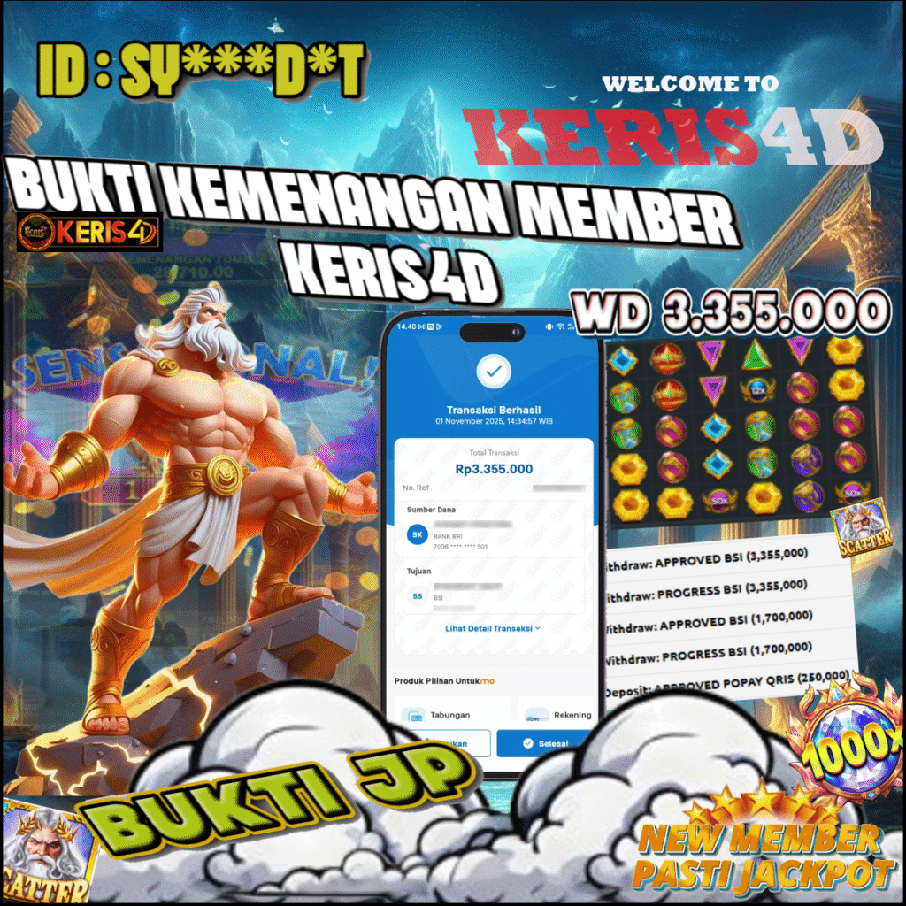 KERIS4D dikenal sebagai situs terpercaya yang selalu menghadirkan pengalaman bermain slot online yang aman, fair, dan berlisensi resmi. Di sini, kami tidak hanya sekadar memberikan janji, tapi bukti nyata berupa slip kemenangan yang dapat Anda lihat secara langsung.