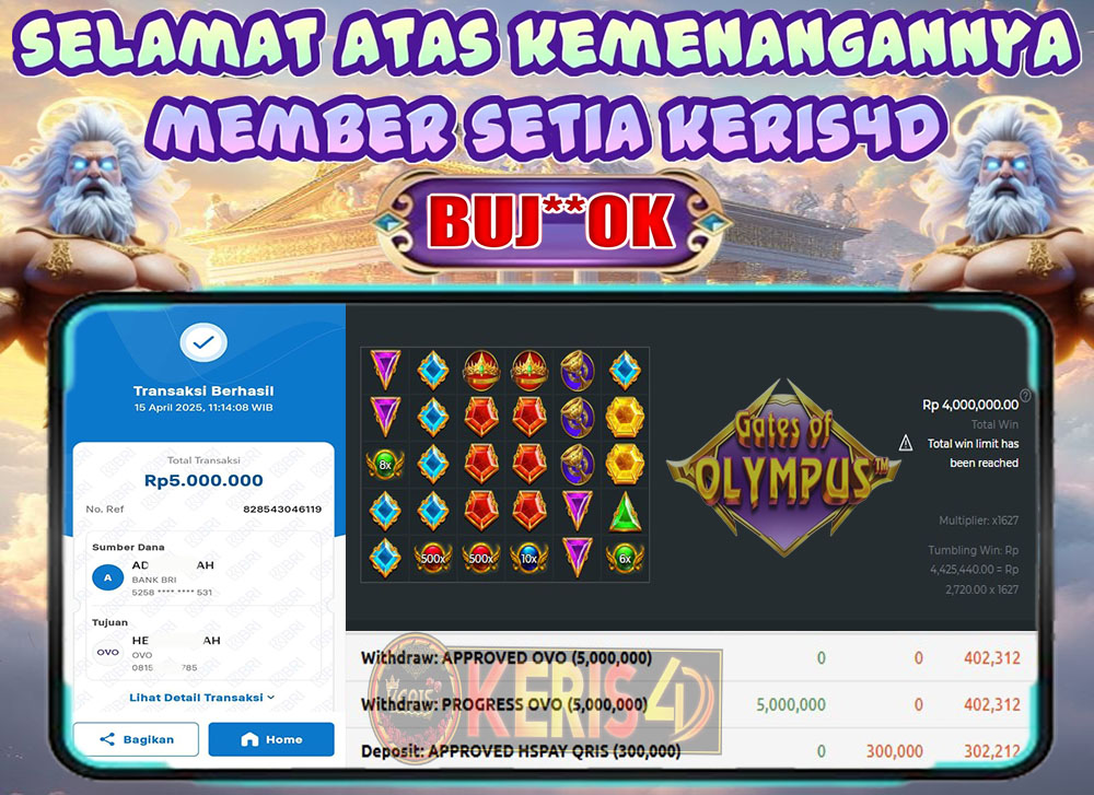Setiap hari, member KERIS4D berhasil meraih jackpot besar dari berbagai provider slot ternama yang kami sediakan, seperti Pragmatic Play, Habanero, PG Soft, dan masih banyak lagi. Kami secara rutin menampilkan bukti screenshot atau rekapan kemenangan yang berhasil diraih, mulai dari kemenangan ratusan ribu hingga puluhan juta rupiah. Semua slip kemenangan ini kami hadirkan untuk membuktikan bahwa di KERIS4D, peluang menang itu nyata.