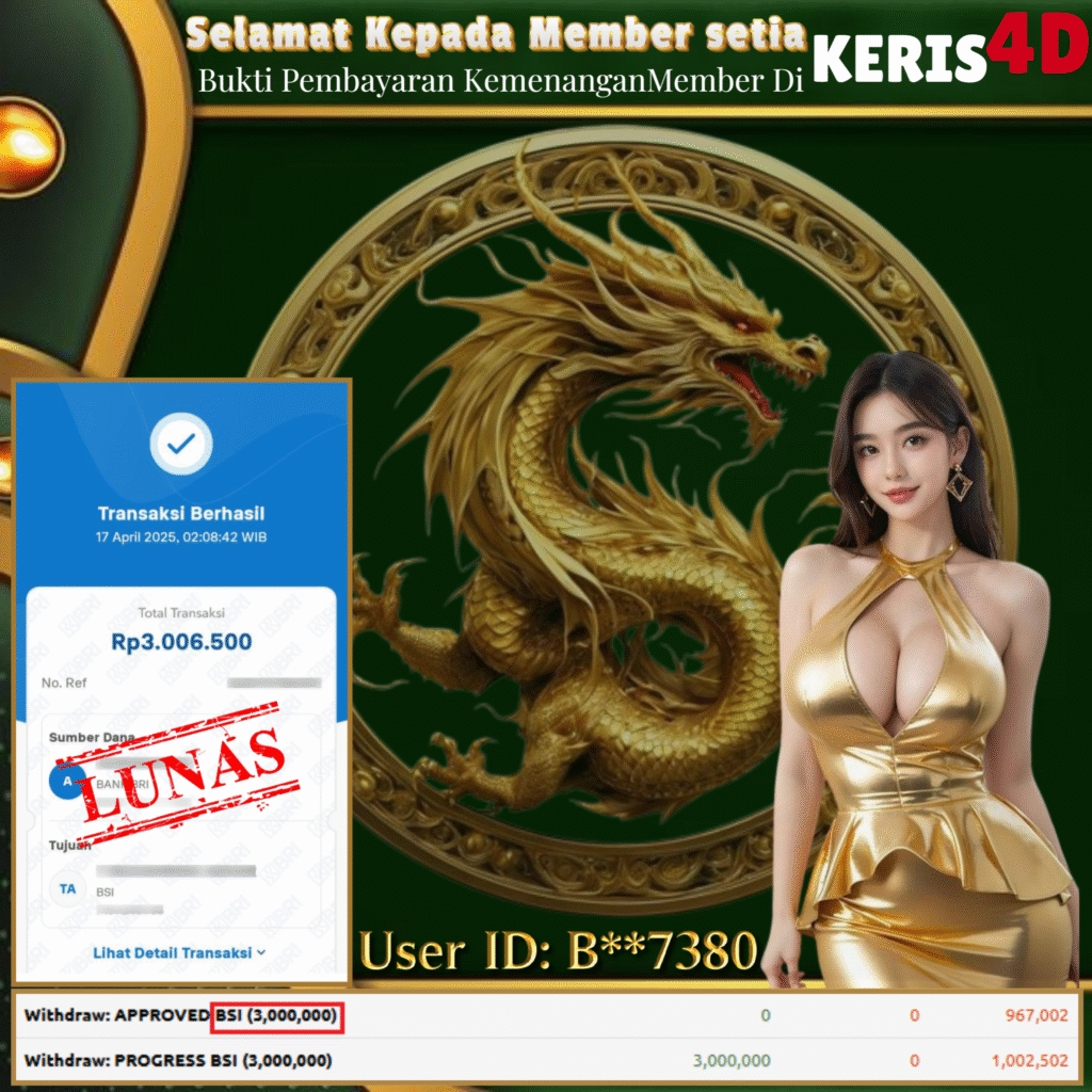 KERIS4D dikenal sebagai situs terpercaya yang selalu menghadirkan pengalaman bermain slot online yang aman, fair, dan berlisensi resmi. Di sini, kami tidak hanya sekadar memberikan janji, tapi bukti nyata berupa slip kemenangan yang dapat Anda lihat secara langsung.
